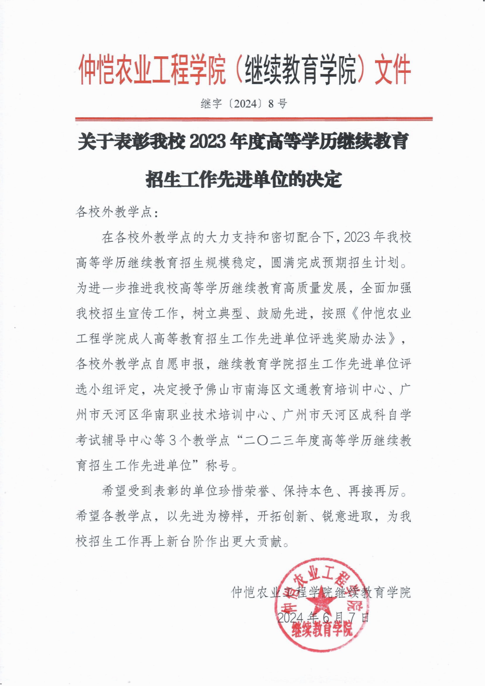 关于表彰我校2023年度高等学历继续教育招生工作先进单位的决定