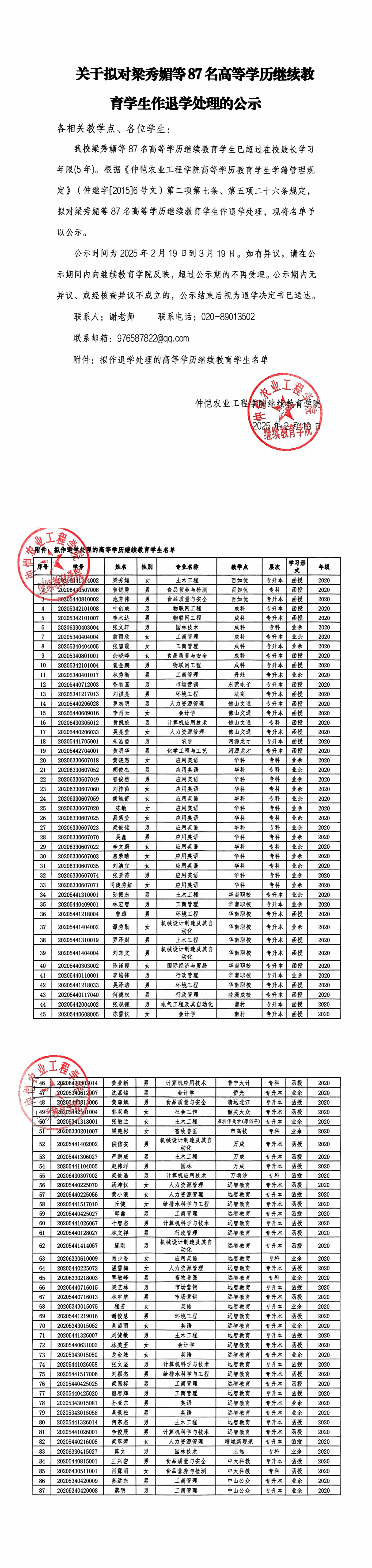 关于拟对梁秀媚等87名高等学历继续教育学生作退学处理的公示