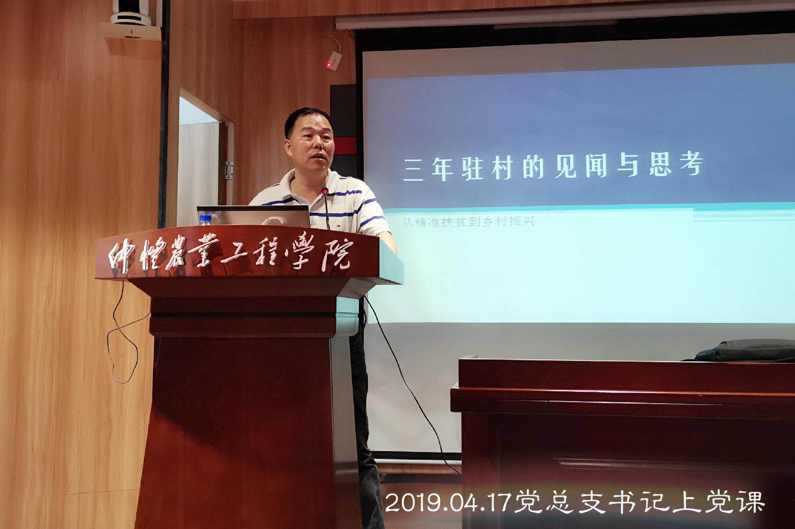 党总支书记刘新周为全体党员上题为《三年驻村的见闻与思考——从精准扶贫到乡村振兴》的党课。他向大家介绍了在我校扶贫点怀集县洊水村为期3年的扶贫工作情况,并从洊水村的产业、土地和残疾人口三个方面切入,用案例分析,真实地展示了扶贫工作的成果和困难,其中种植百香果、建成光伏发电和升级改造农贸市场等项目都切实给村民带来了收益。他指出,一个成功的扶贫产业项目必须形成一个良好的产业化生态链条;土地的规范管理则需要政府加强力度介入;虽然国家已经建立了比较完善的残疾人口保障机制,但仍存在执行不到位的情况。同时,对于如何调动村民参与新农村建设的积极性主动性、建立乡村振兴的长效机制等方面提出了一些见解。他认为,只有深入基层、科学分析、实事求是、找准“贫根”,才能从根本上解决贫困问题。而精神“贫根”是扶贫工作中的难题,如何在“扶志”上探索出更有效的办法,则是扶贫工作的重点。