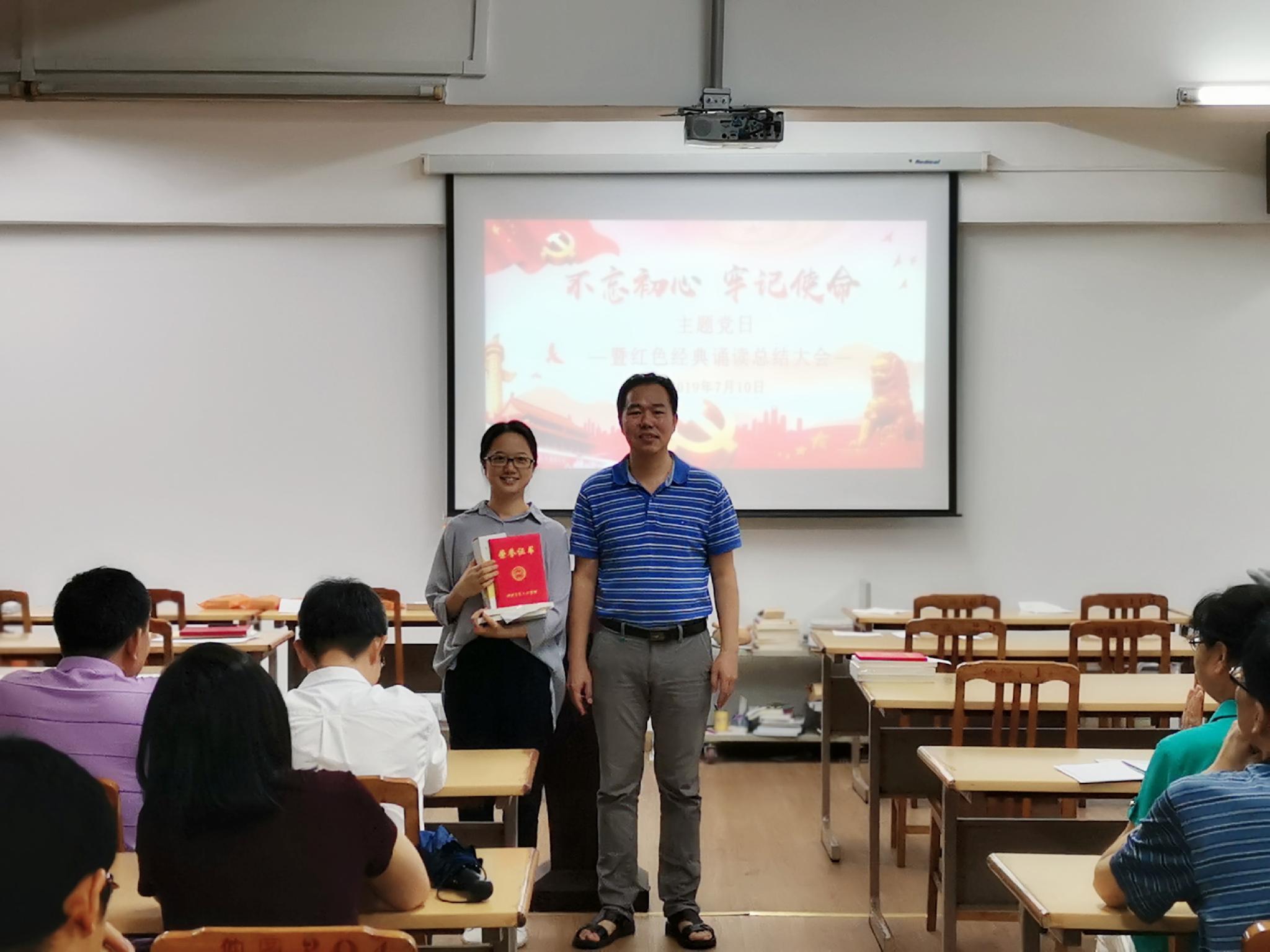 为了庆祝中华人民共和国成立70周年,中国共产党建党98周年,大力弘扬爱国主义精神,教辅与附属单位党总支于近期举办了以“不忘初心、牢记使命”为主题的红色经典诵读比赛。此次活动充分利用图书馆现有设备“朗读亭”,发动党员、教职工近30人参积极参加,提交参赛作品近50件。赛后,党总支组织校外专家对参赛作品进行评奖,评出一等奖1名、二等奖3名(组)、三等奖5名(组),并设有鼓励奖、最佳人气奖若干。其中一等奖的获得者为廖仲恺何香凝纪念馆的林珏,其参赛作品名称为《如果有来生》。近日,结合开展“不忘初心、牢记使命”主题党日活动,为“红色经典诵读比赛”的获奖者进行颁奖。
