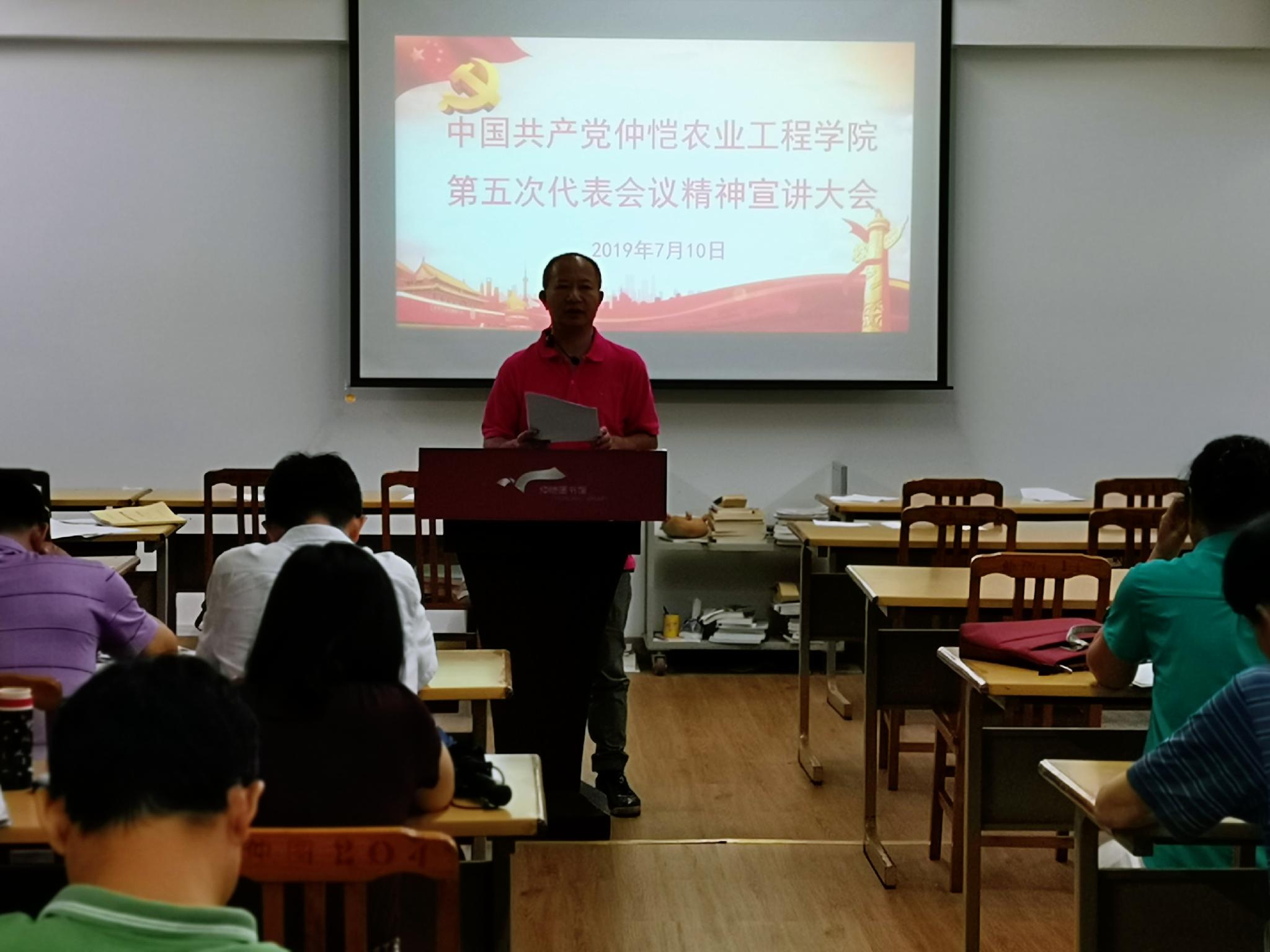 会上,党代会代表何斌成介绍了中共仲恺农业工程学院第五次党代会的基本情况,本次党代会实事求是地回顾了学校92年的办学历史和32年的本科教育历程,以及学校第四次党代会以来的工作成绩和不足,进一步明确了未来30年的发展战略和今后5年的工作思路、目标定位、主要任务和坚强保障。这次大会的主题是:不忘初心,牢记使命,高举习近平新时代中国特色社会主义思想伟大旗帜,深入贯彻落实全国高校思想政治工作会议、全国教育大会及习近平总书记视察广东重要讲话精神,坚持党的全面领导,坚持立德树人,推进内涵式发展、高质量发展,为建设新时代特色鲜明的高水平应用型大学而努力奋斗。何斌成还代表党总支要求各支部制定学习宣传贯彻学校第五次党代会精神实施方案,组织干部职工继续深入学习。