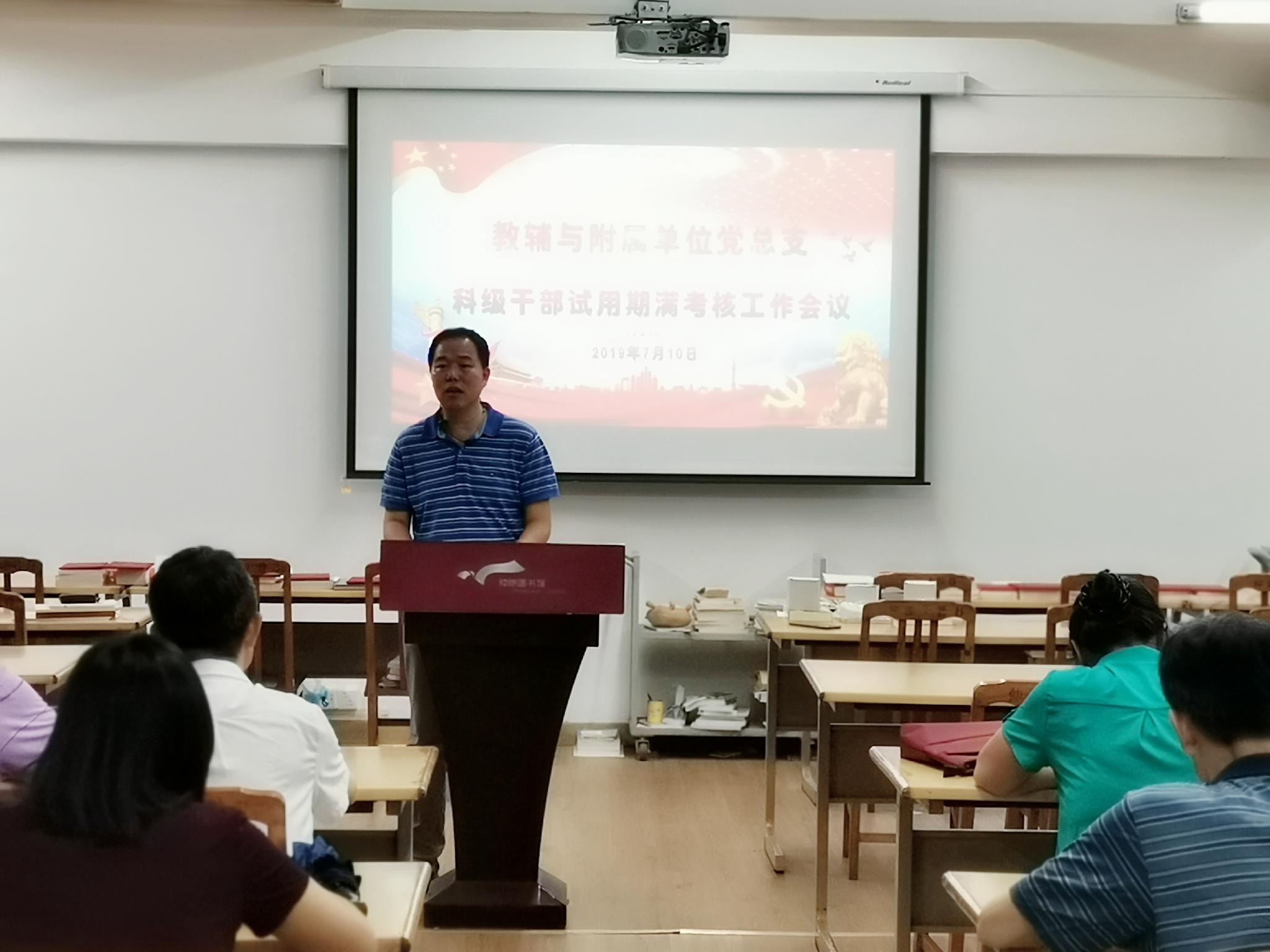7月10日上午,教辅与附属单位党总支召开科级干部试用期满考核工作会议,所属单位干部职工代表60人出席了会议,会议由党总支书记刘新周同志主持。本次考核的对象是学报编辑部的办公室副主任施祖荣,她就一年多来的工作,在德、能、勤、绩、廉五个方面的情况,向大家做了述职报告。与会干部职工代表按照学校有关要求对考核对象进行了民主测评。