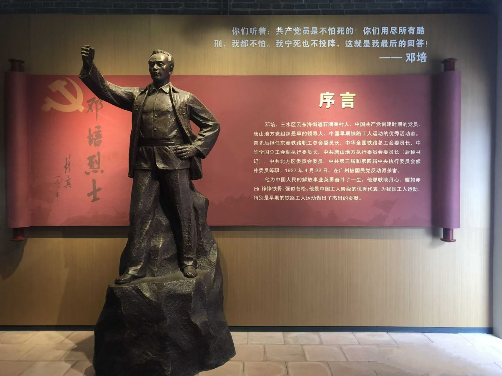 在邓培烈士故居内,大家通过观看展品和图片,现场聆听讲解员的详细讲述,了解到邓培烈士的生平事迹和革命精神。邓培是中共创建时期最早的党员之一,也是早期铁路工人运动的先驱,他从一名普通的铁路工人,逐渐成长为一名工人运动革命家。1927年4月15日,国民党反动派在广州发动反革命政变,邓培在广州被捕。狱中,邓培遭到敌人的威逼利诱、严刑拷打,但他始终坚定信念,严守党的纪律和党的秘密。4月22日,邓培在广州英勇就义,年仅44岁。